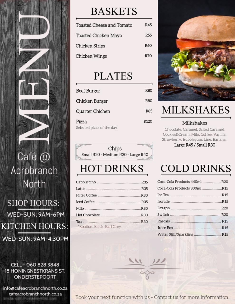 Welcome to the Acrobranch North Hospitality and Adventure Collective, your destination for nature and fun. Our central hub, The Bushveld Coffee Shop, is pet-friendly and open Wednesday–Sunday.